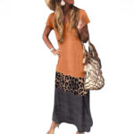 Casualloosecontrast彩色豹紋拼布短袖印花v領長裙休閒長裙時尚優雅